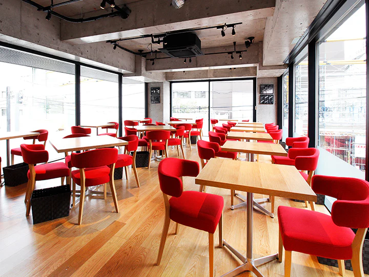 店舗2階のカフェでは、こだわりのケーキやマカロン、ドリンクを楽しめます。表参道の大通りより一本奥に入った、落ち着いた通りの中、ガラス張りで開放的な空間でのゆったりとしたカフェタイムが楽しめます。