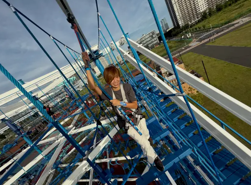 週末に思いっきり体を動かして笑い合いたい2人には、このスリル満点の“空中アスレチック”体験がおすすめ。東京都内にありながら、ビルの5階相当の高さで本格的な綱渡りやロープ渡りが体験できるアクティビティです。ハーネス付きなので安全面もばっちり。
