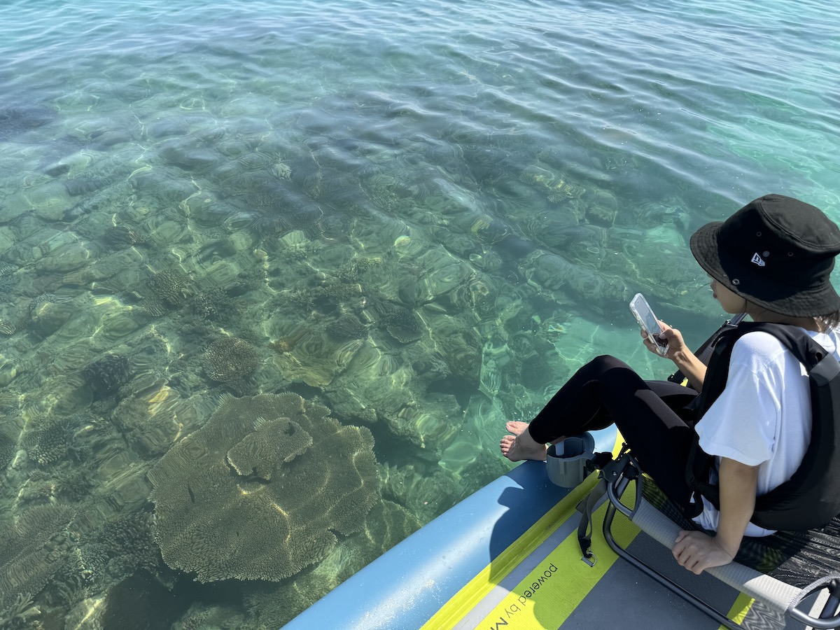 ボードの下にはサンゴ礁や熱帯魚がくっきりと見えます。海をベッドに寝ころべば、空、海、自分が一体化したかのような感覚に。体験の様子はドローンが空撮しているので、SNSにアップも可能です。