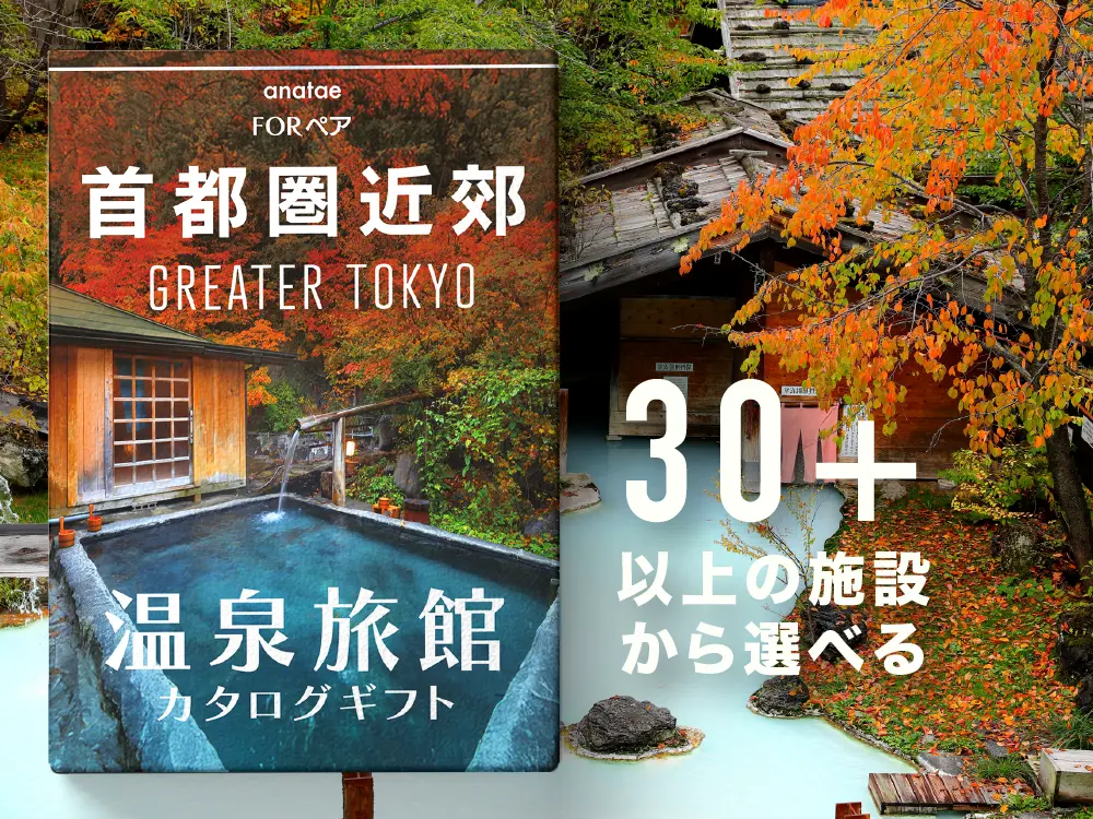 東京近郊の厳選した温泉旅館30軒以上から宿泊先を選べるペア宿泊カタログギフト。東京の喧騒から離れて羽を伸ばしたいという方に最適な旅行ギフトです。草津温泉や湯河原温泉、強羅温泉、箱根湯本温泉などにある、選び抜かれた宿だけを集めたこのギフトは、1泊2日から3泊4日まで選べるペアチケット。遠出する時間が取れない方でも利用しやすく、週末旅行にもぴったりのギフトです。